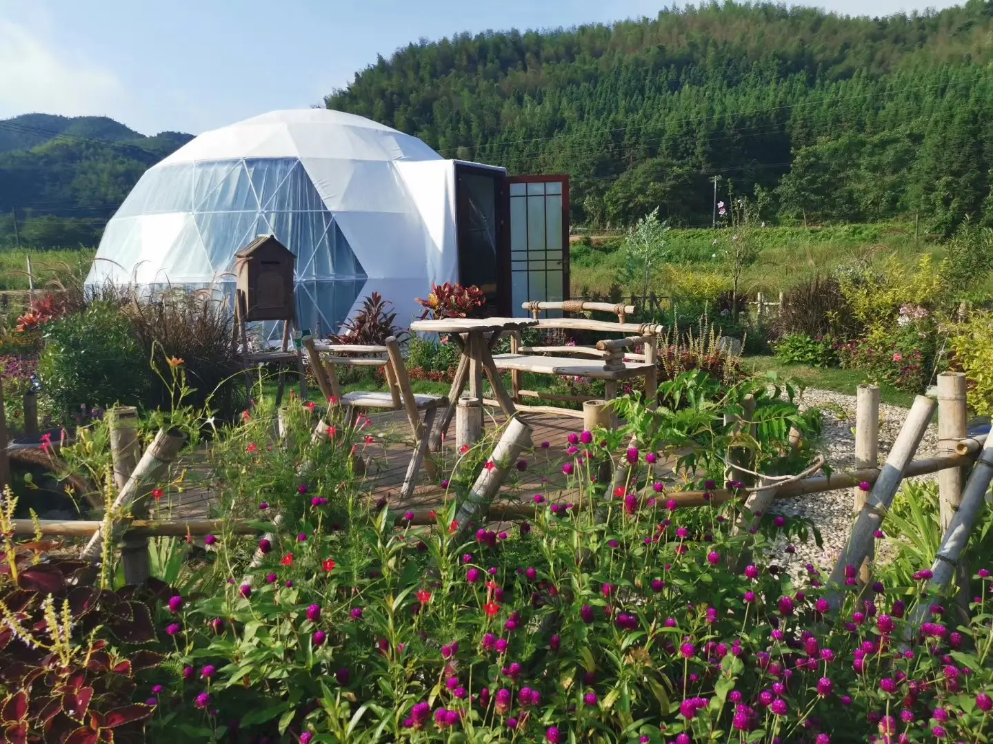 You can choose PVC fabric, PC panel, or glass as the cover material for the greenhouse. PVC fabric is economically efficient and show great waterproof and UV-resistant perfomance. PC panels have durability and can adapt to changing climates.Glass has the highest light transmittance and can achieve a very beautiful effect.